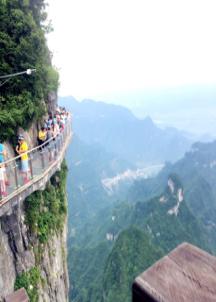 7日早上,我們來到了此行第一站——天門山。天門山海拔1500多米,因自然奇觀天門洞而蜚聲世界,被譽(yù)為“湘西第一神山”和“武陵之魂”。我們乘著觀光大巴沿著逶迤曲折的公路盤旋而上,只見壁立千仞,懸崖萬丈,每逢轉(zhuǎn)彎,車內(nèi)一片驚呼,盡顯刺激與緊張。下車后,我們繼續(xù)前行,當(dāng)大家爬過999層階梯最終到達(dá)巨大的天門洞前時(shí),不禁感嘆大自然的鬼斧神工,神秘玄奇。往下眺望,林木蒼翠,山腳下的湖波像綠寶石一樣鑲嵌其中,美不勝收。清風(fēng)徐來,令人神清氣爽,視野開闊,豪氣頓生。天門山上的玻璃棧道,依峭壁凌空而建,讓人望而生畏,行而卻步。大家都小心翼翼,體驗(yàn)雙腳處于萬丈深谷之上的驚險(xiǎn)。